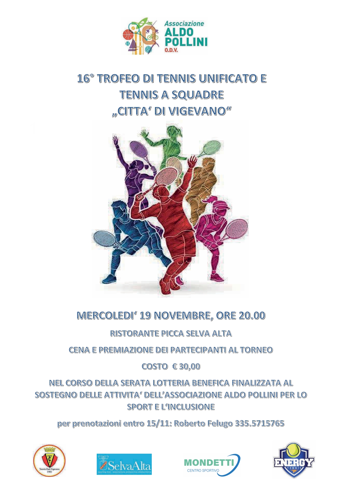 L’Associazione Aldo Pollini O.D.V. è lieta di invitarvi alla serata di premiazione del 16° Trofeo di Tennis Unificato e Tennis a Squadre “Città di Vigevano”. L'appuntamento è per mercoledì 19 novembre alle ore 20.00 presso Ristorante Picca Selva Alta. La quota di partecipazione è di €30. Nel corso della serata si svolgerà la tradizionale lotteria a sostegno delle attività dell’Associazione. Un’occasione per celebrare insieme i valori dello sport e contribuire concretamente ai progetti di integrazione che ogni anno portano in campo entusiasmo, amicizia e condivisione. ...